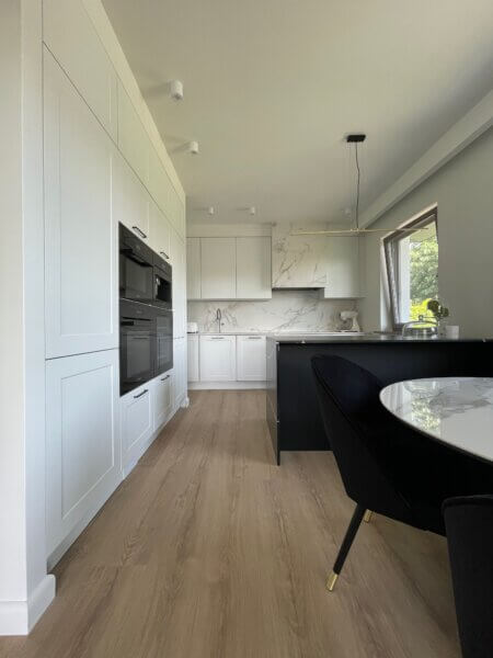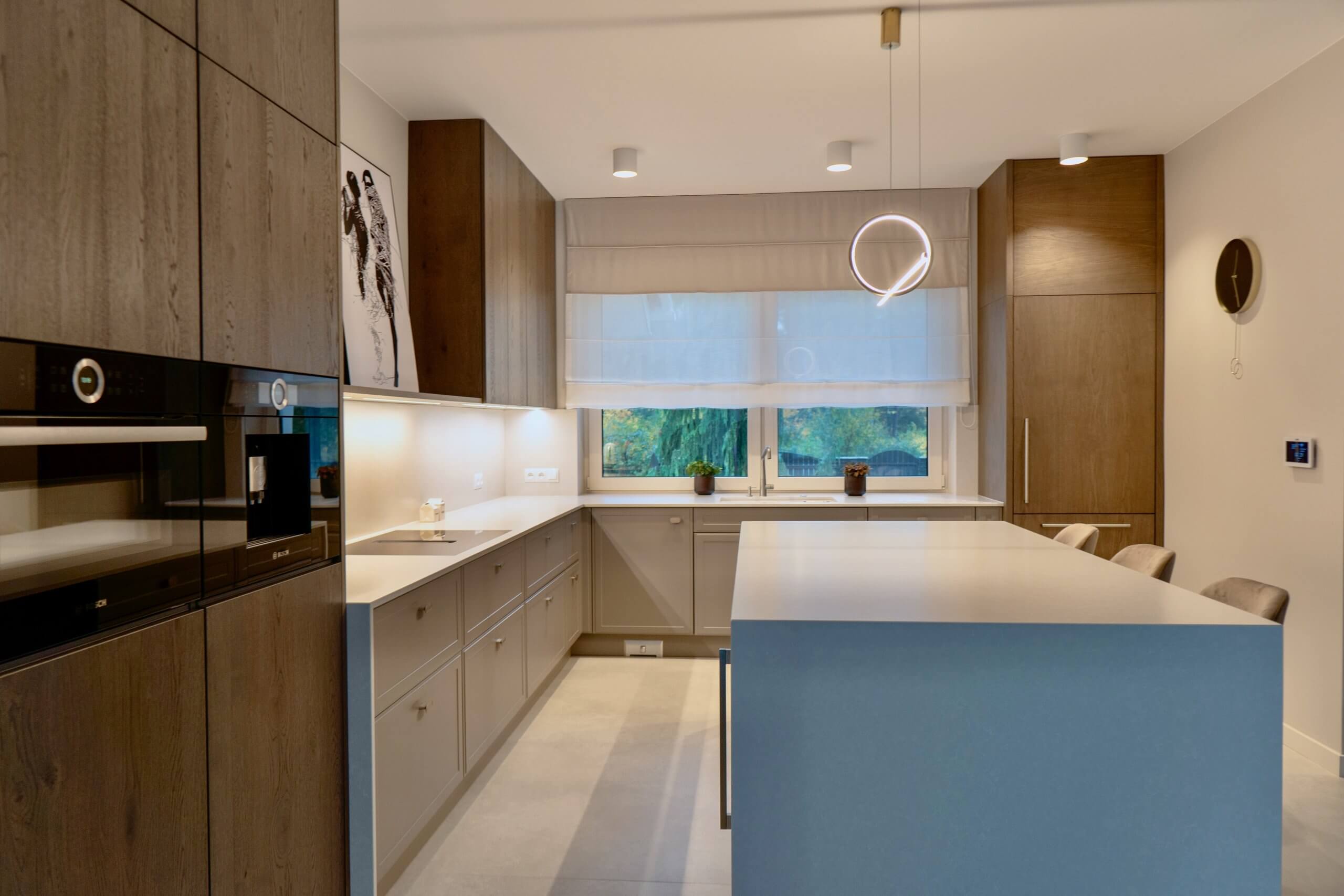 Inwestorzy marzyli o kuchni, która połączy strefę dzienną z funkcjonalnym zapleczem do gotowania. Zależało im na dużej wyspie, wygodnej przestrzeni roboczej oraz spójnej kolorystyce z resztą wnętrza. Na etapie projektowym zaproponowaliśmy układ z wyspą oraz zabudową w kształcie litery „U”, który pozwolił maksymalnie wykorzystać dostępną przestrzeń.
