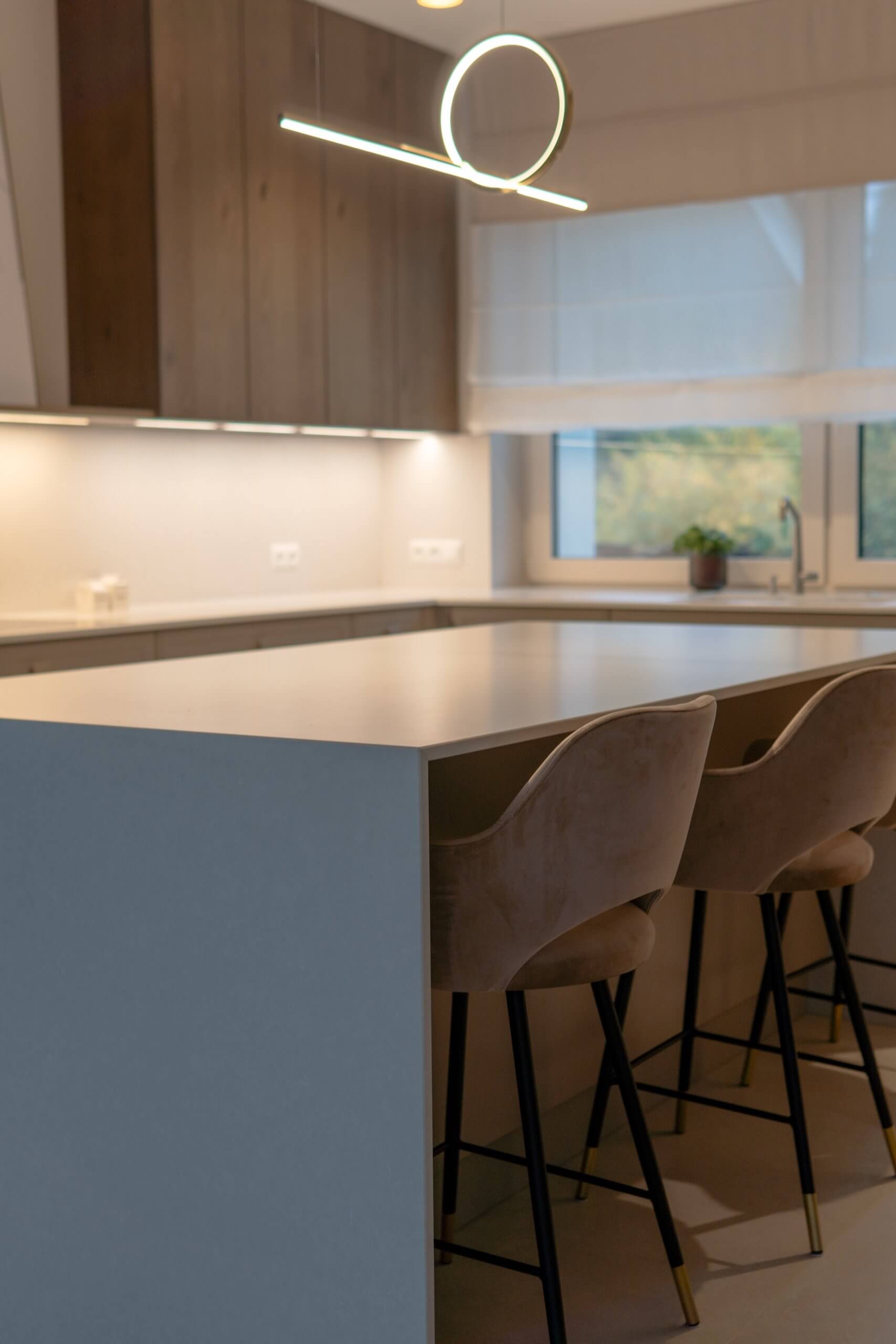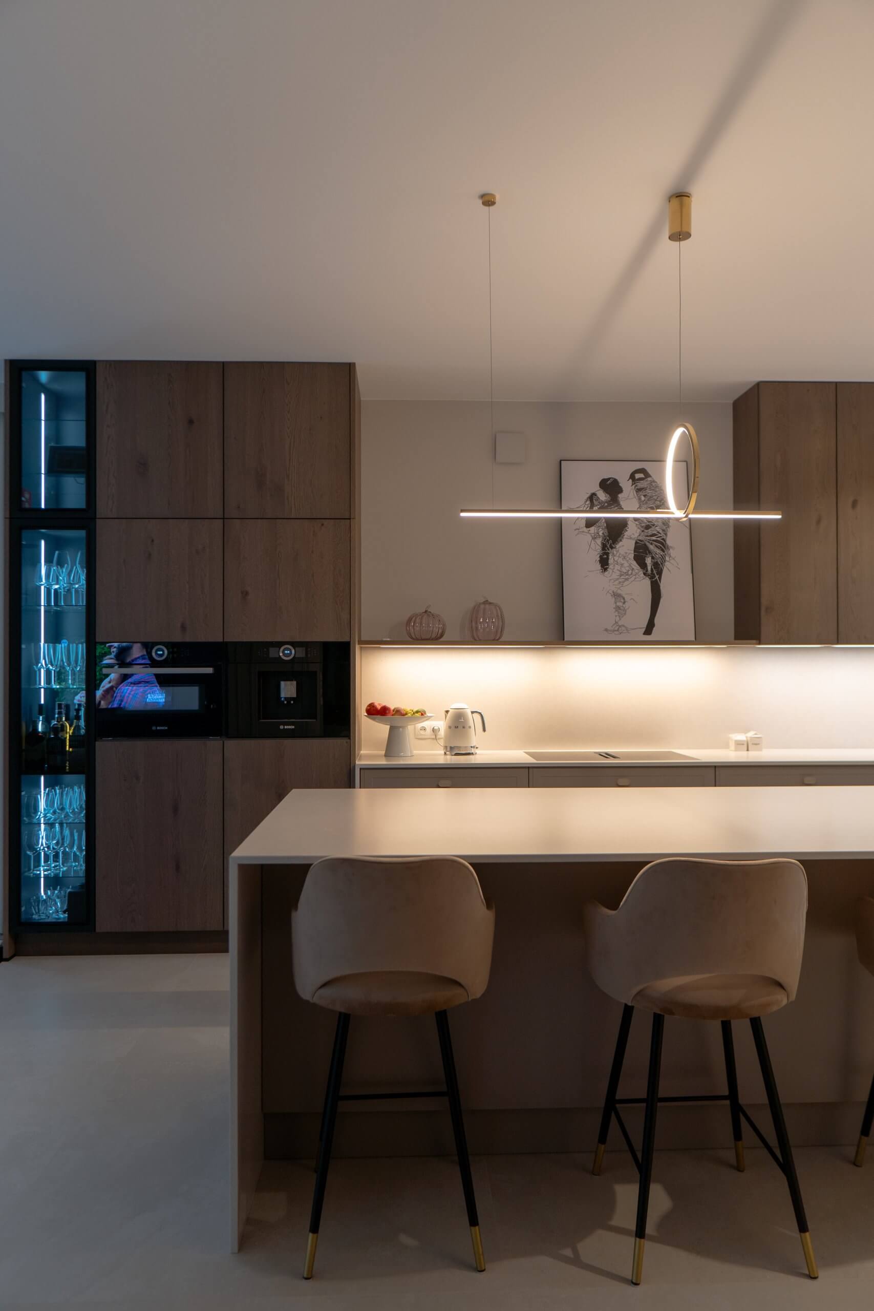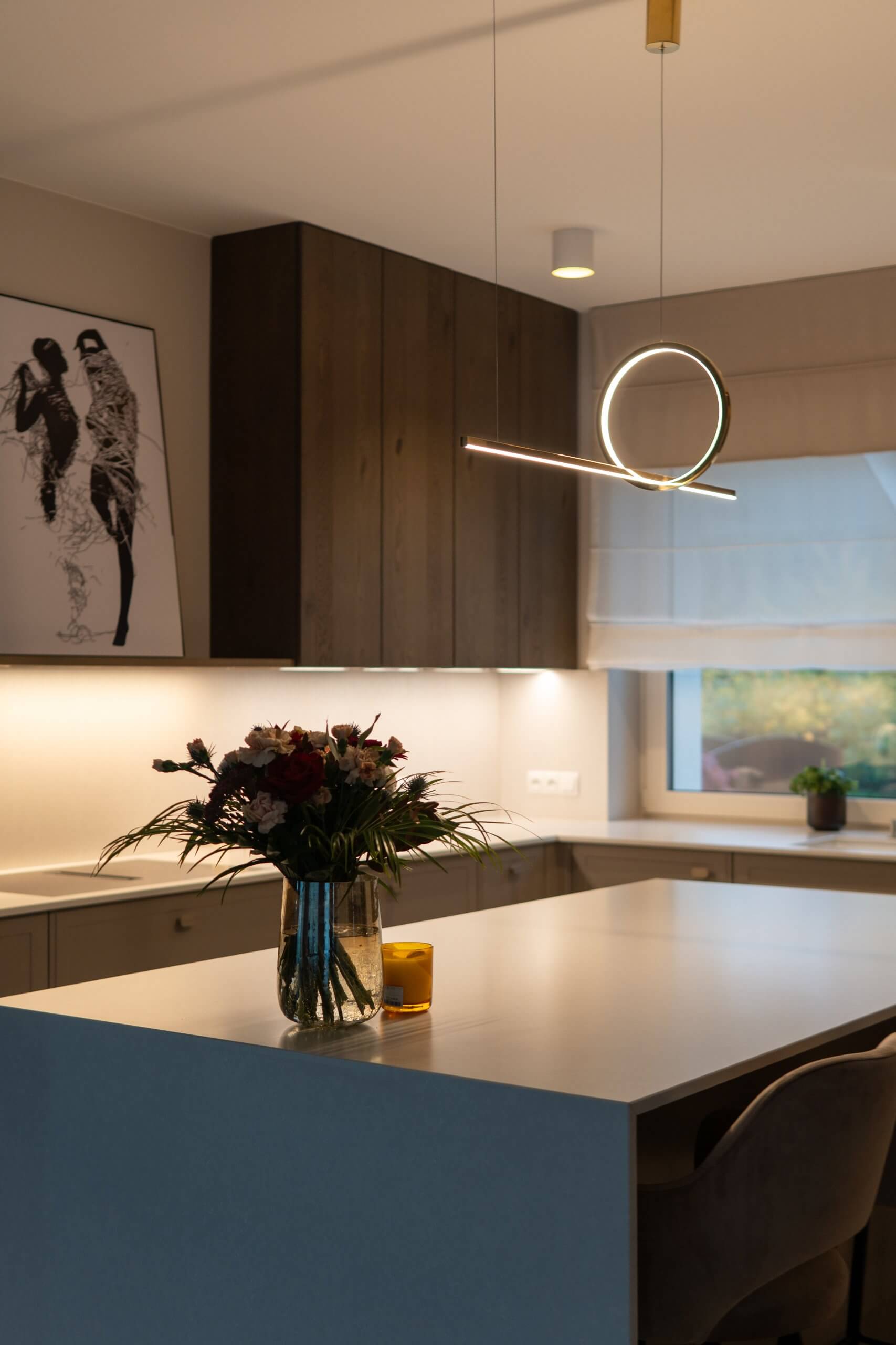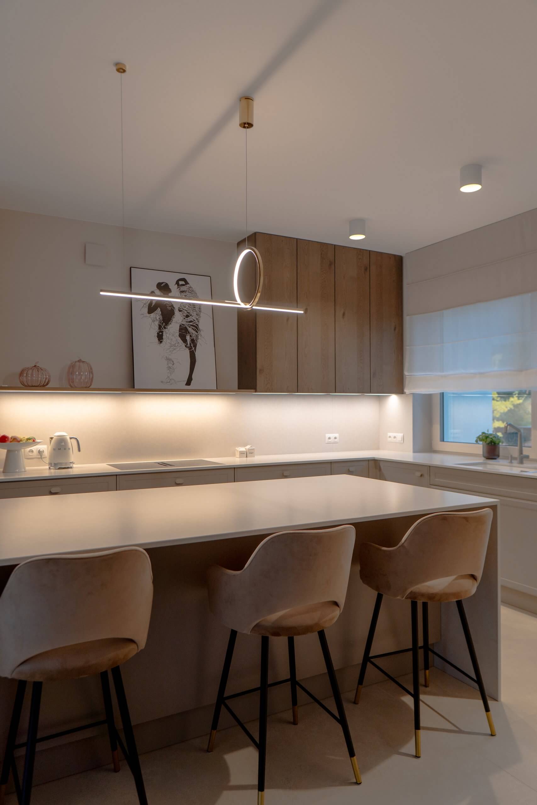 Dużą uwagę poświęciliśmy oświetleniu – listwy LED pod szafkami, pionowe podświetlenie witryny oraz minimalistyczna lampa nad wyspą tworzą kilka scen świetlnych, które można dopasować do pory dnia i nastroju. Dzięki temu kuchnia prezentuje się efektownie zarówno w naturalnym, jak i wieczornym świetle.