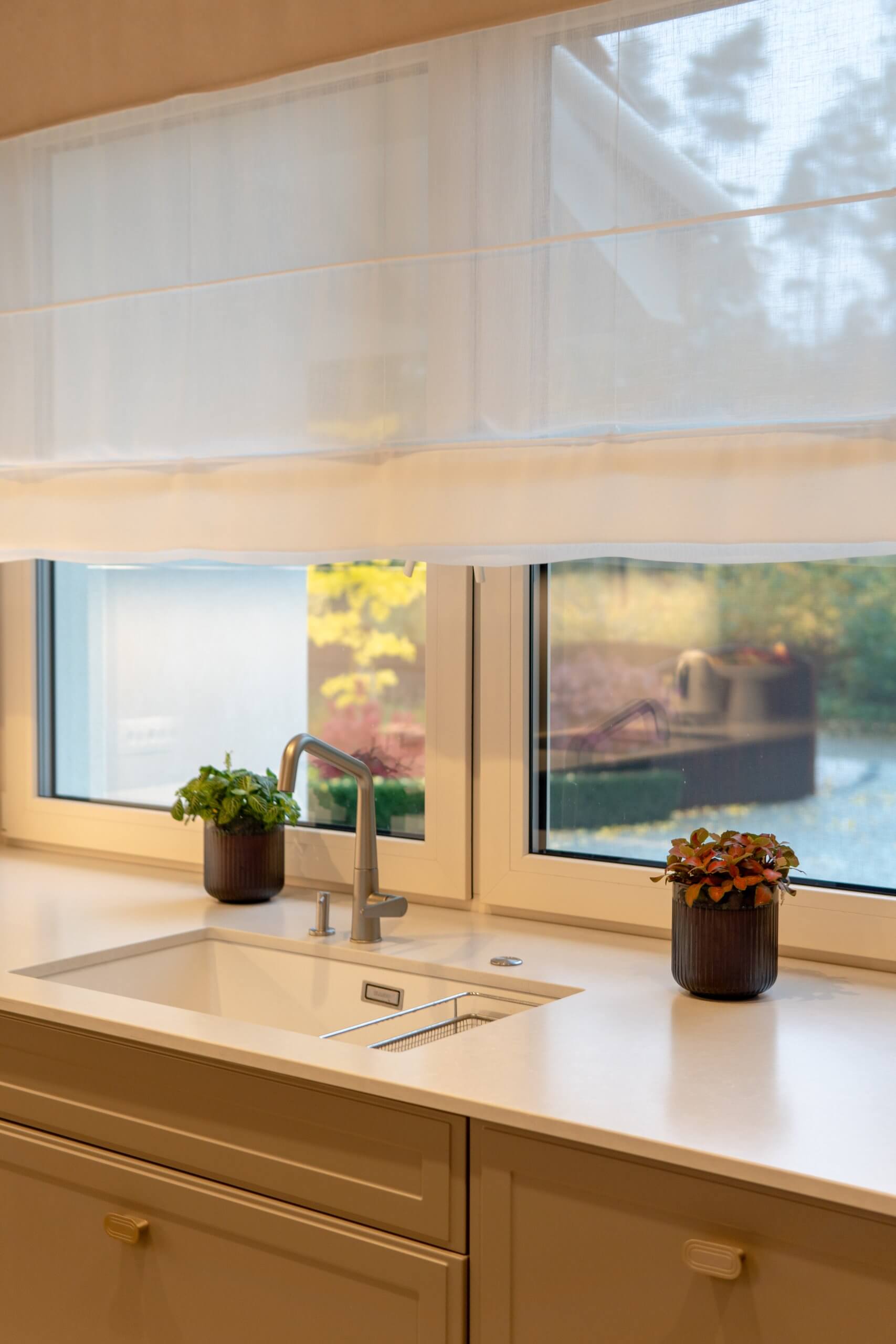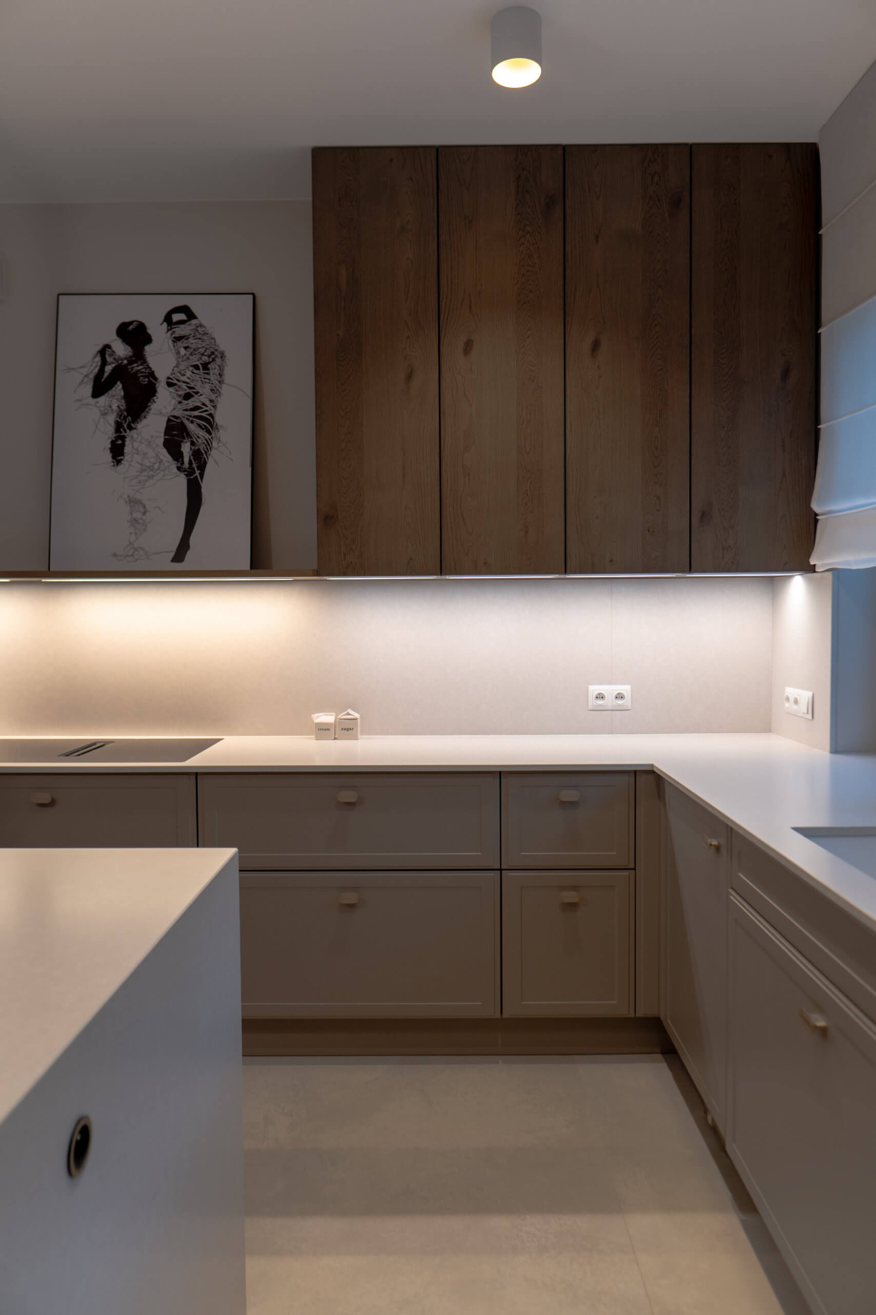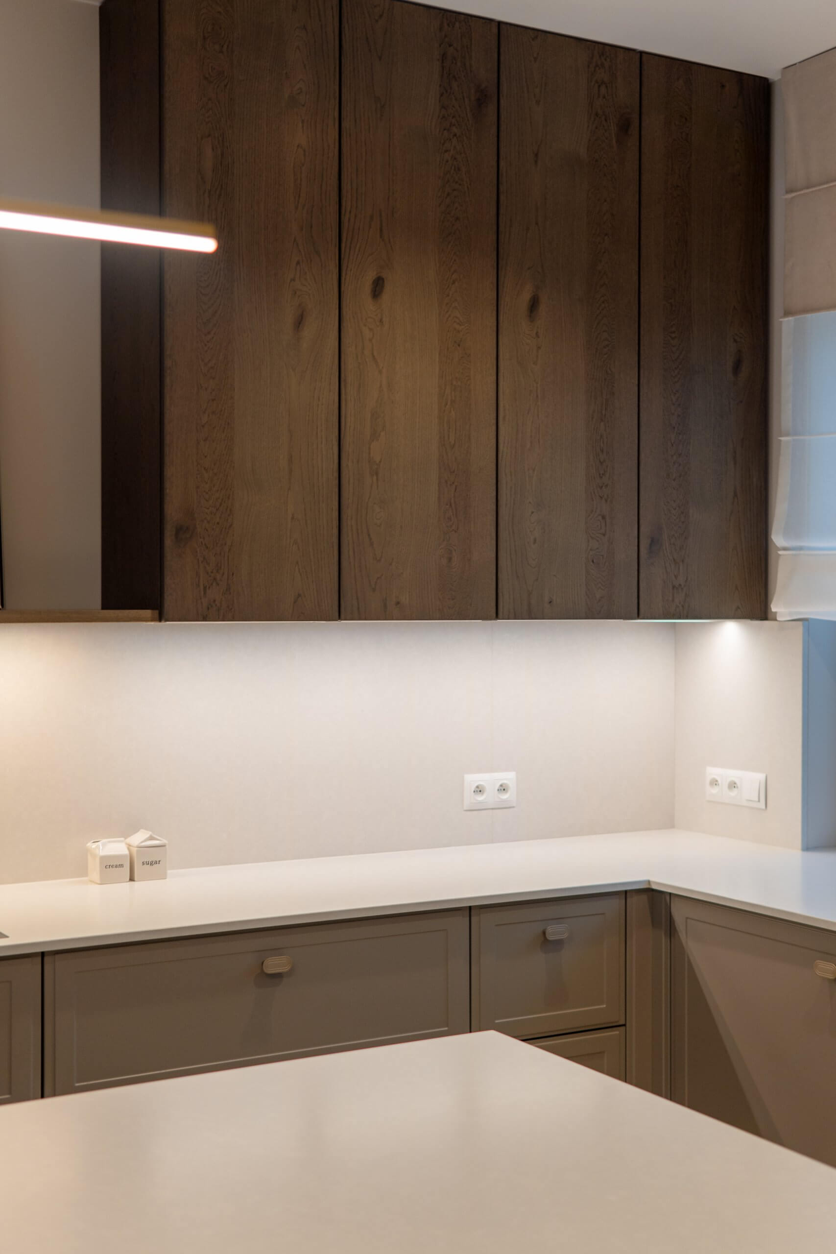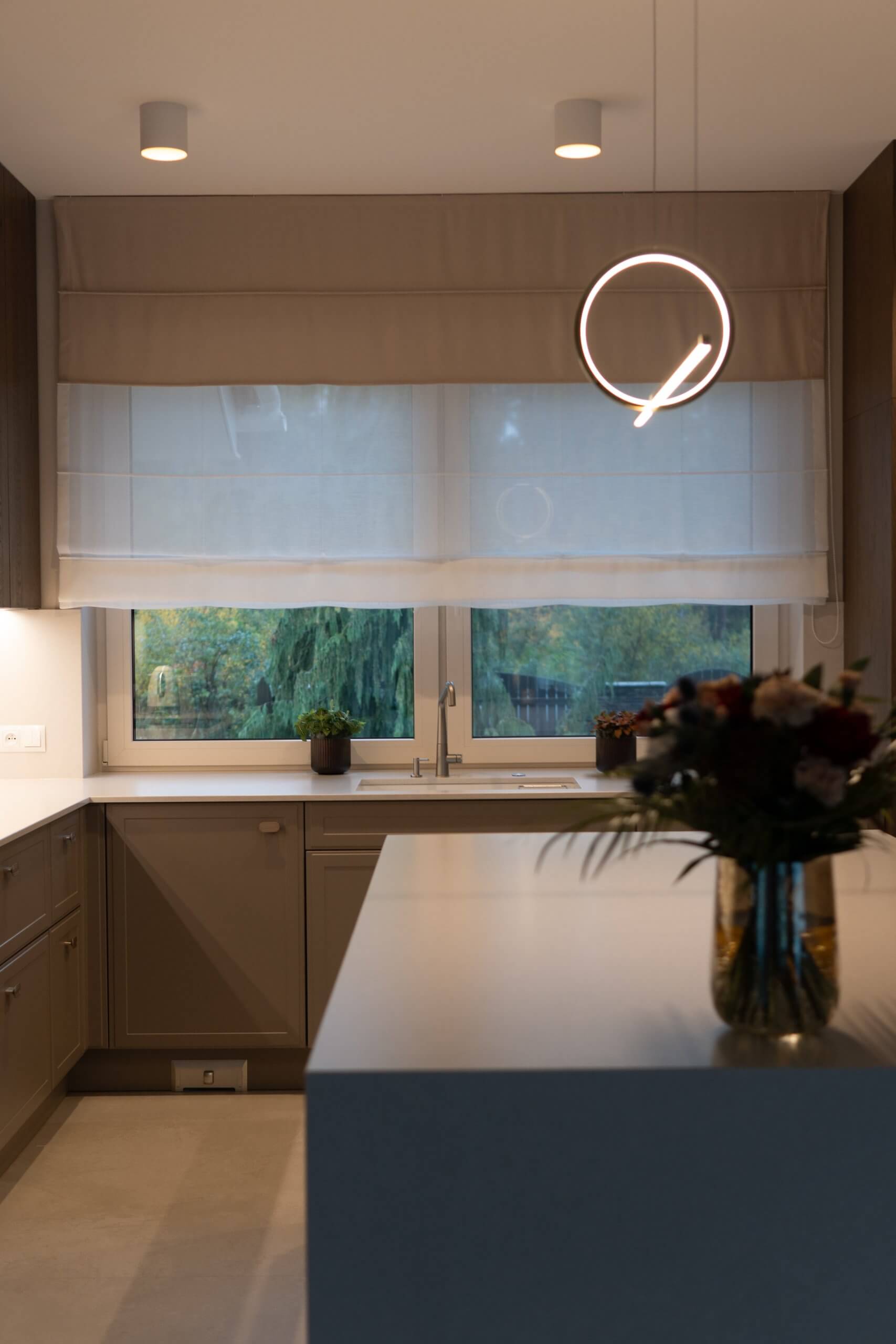 Dużą uwagę poświęciliśmy oświetleniu – listwy LED pod szafkami, pionowe podświetlenie witryny oraz minimalistyczna lampa nad wyspą tworzą kilka scen świetlnych, które można dopasować do pory dnia i nastroju. Dzięki temu kuchnia prezentuje się efektownie zarówno w naturalnym, jak i wieczornym świetle.