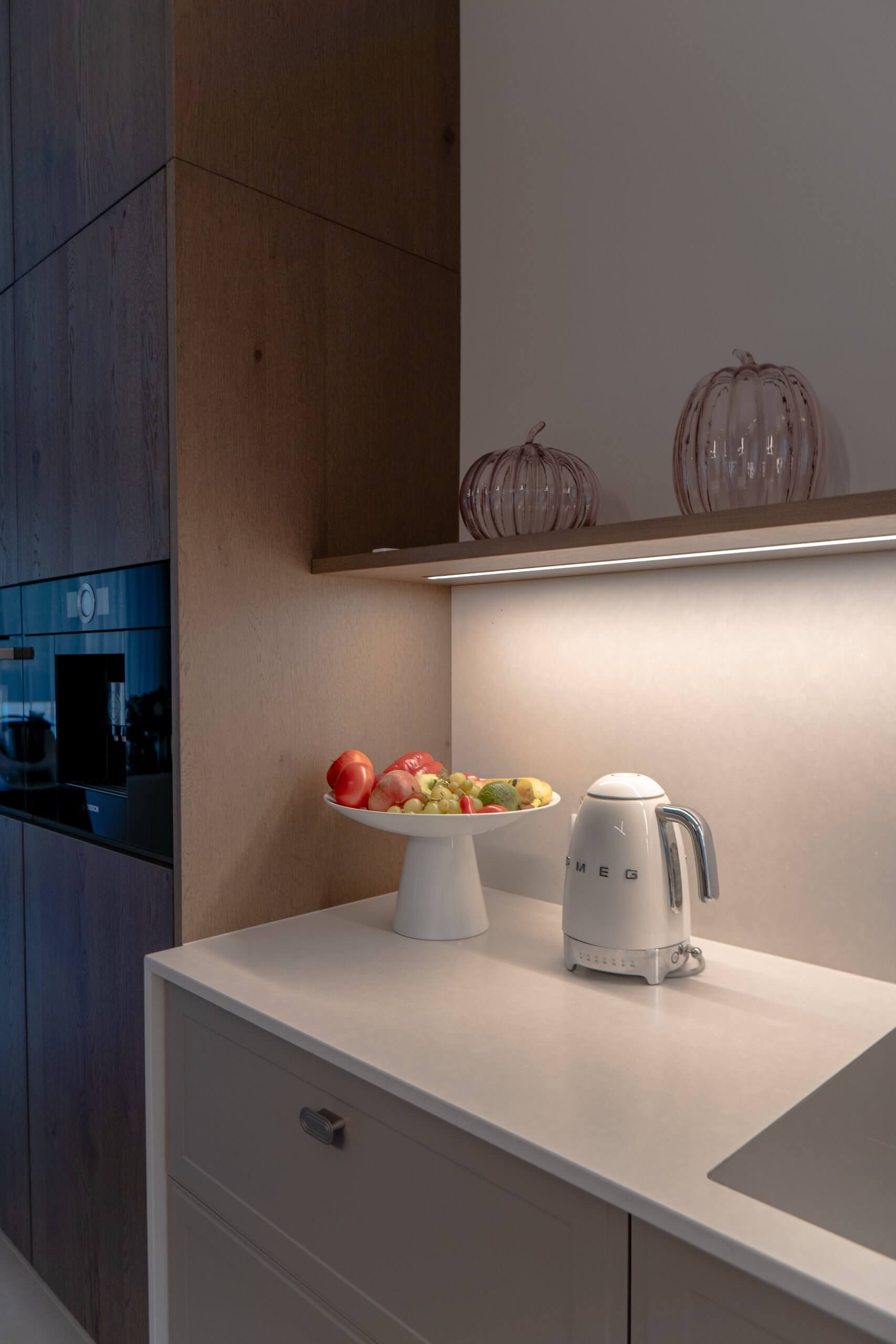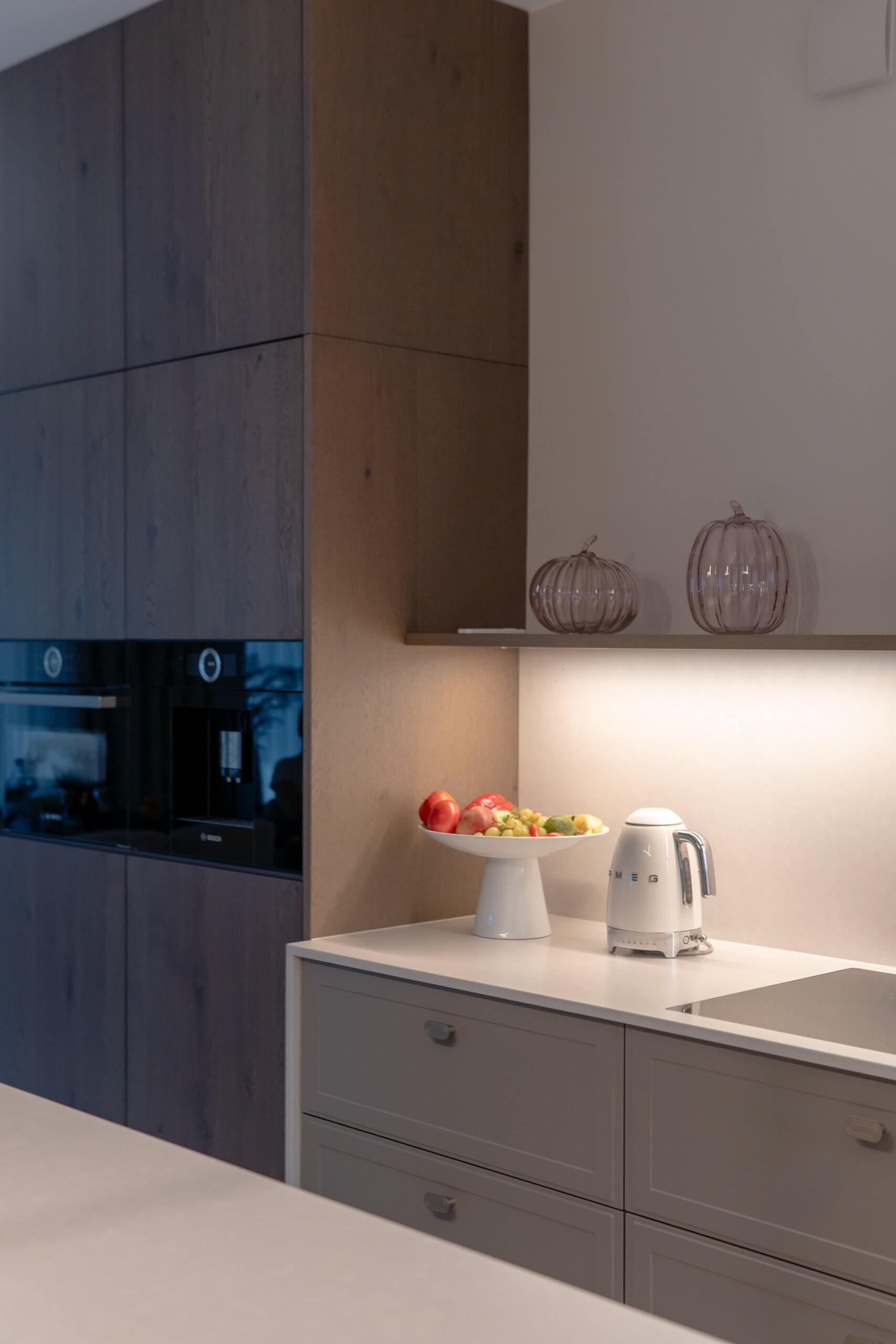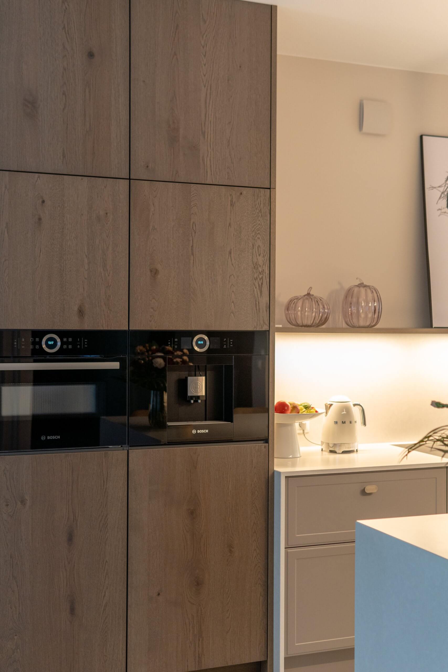 Wysokie słupki z forniru po obu stronach kuchni spinają wnętrze kompozycyjnie i mieszczą pełnowymiarowe sprzęty. W centralnej części zaplanowaliśmy strefę gotowania i przygotowywania posiłków, z jasnym blatem i delikatnym tłem ściany, które nie przytłacza wnętrza. Uzupełnieniem jest przeszklona witryna z podświetleniem, dodająca całości lekkości.