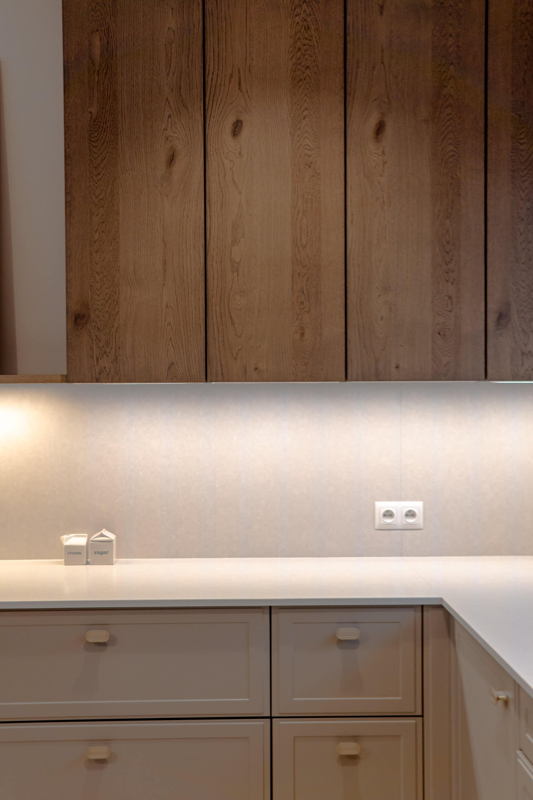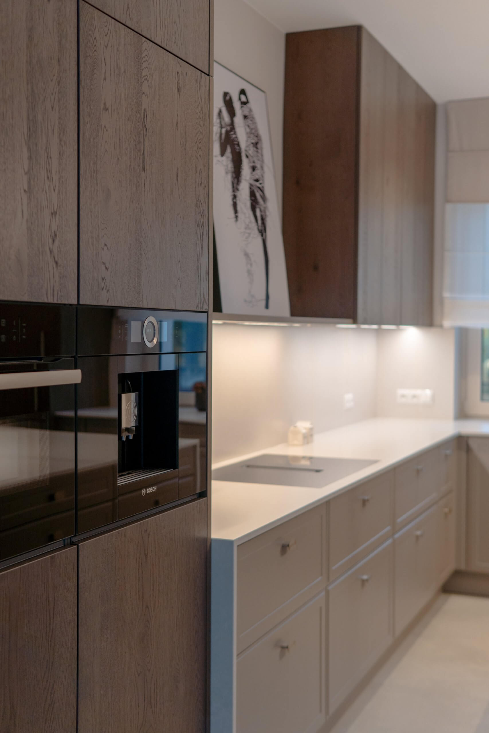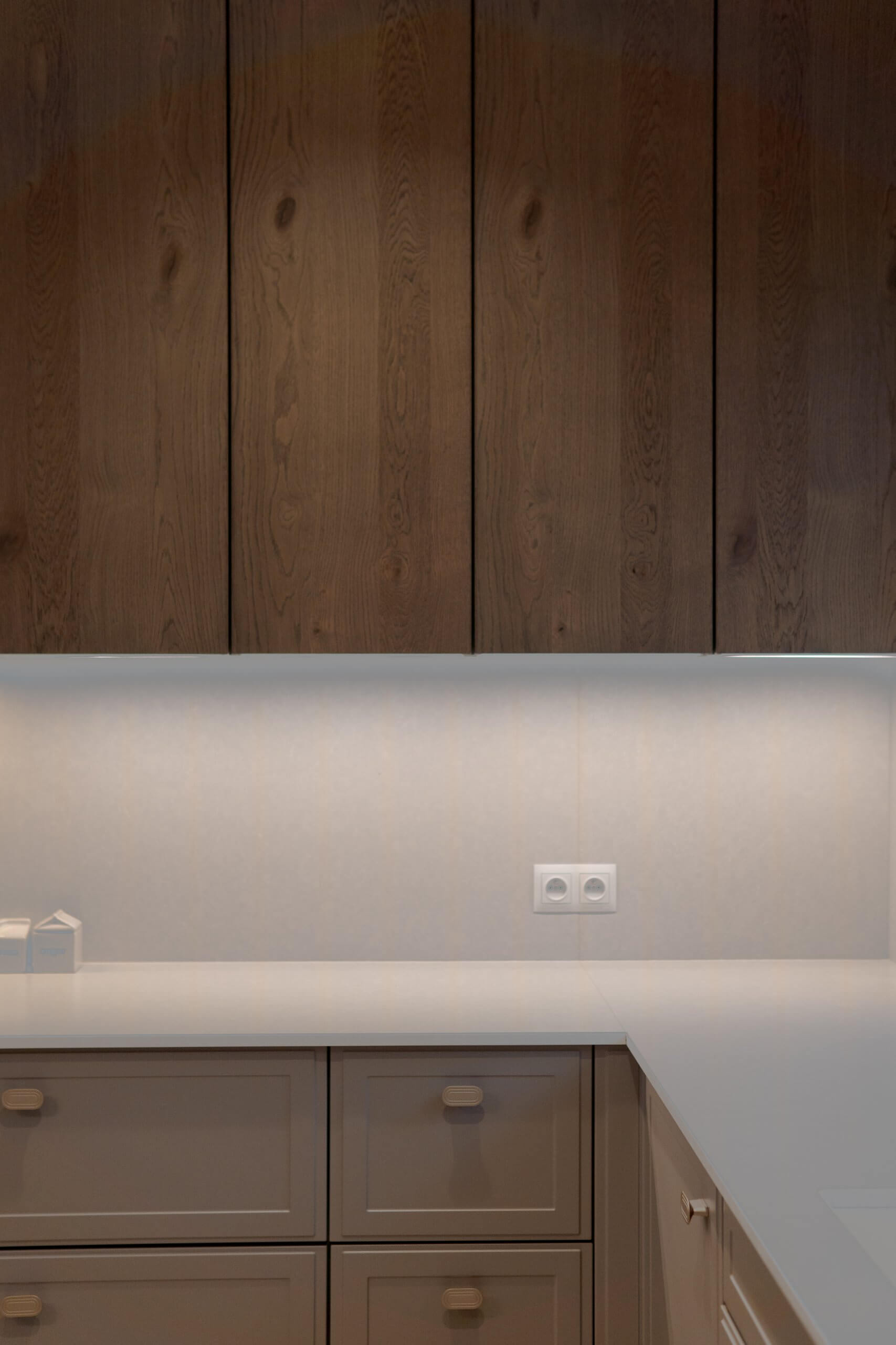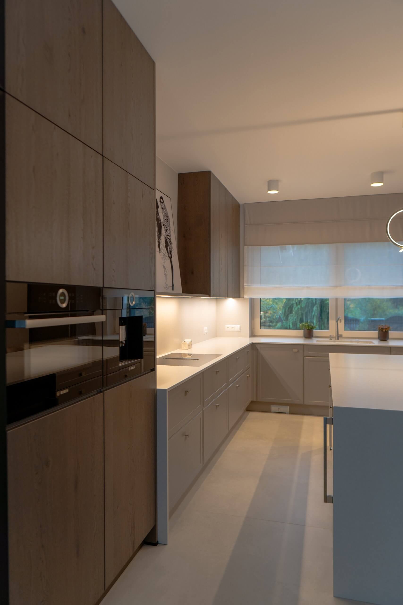 Wysokie słupki z forniru po obu stronach kuchni spinają wnętrze kompozycyjnie i mieszczą pełnowymiarowe sprzęty. W centralnej części zaplanowaliśmy strefę gotowania i przygotowywania posiłków, z jasnym blatem i delikatnym tłem ściany, które nie przytłacza wnętrza. Uzupełnieniem jest przeszklona witryna z podświetleniem, dodająca całości lekkości.
