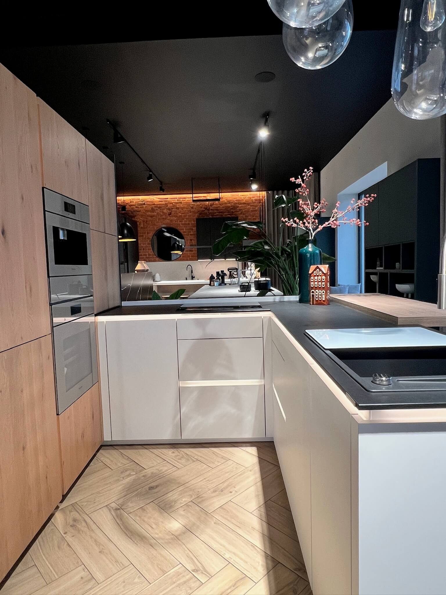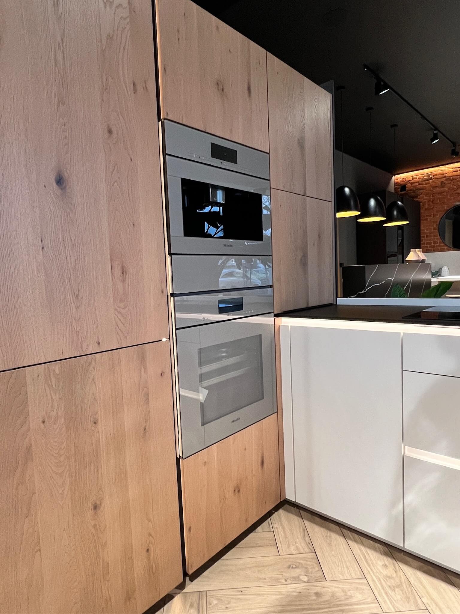 Elegancki, ciepły fornir dębowy w połączeniu z gładkimi, jasnymi frontami tworzy kuchnię, która wygląda jak nowa realizacja z katalogu, a nie model z wyprzedaży. Zabudowa w kształcie litery U zapewnia wygodną, ergonomiczną strefę pracy: wysokie słupki mieszczą piekarnik i urządzenie kompaktowe na komfortowej wysokości, a długie blaty dają dużo miejsca do gotowania i serwowania.