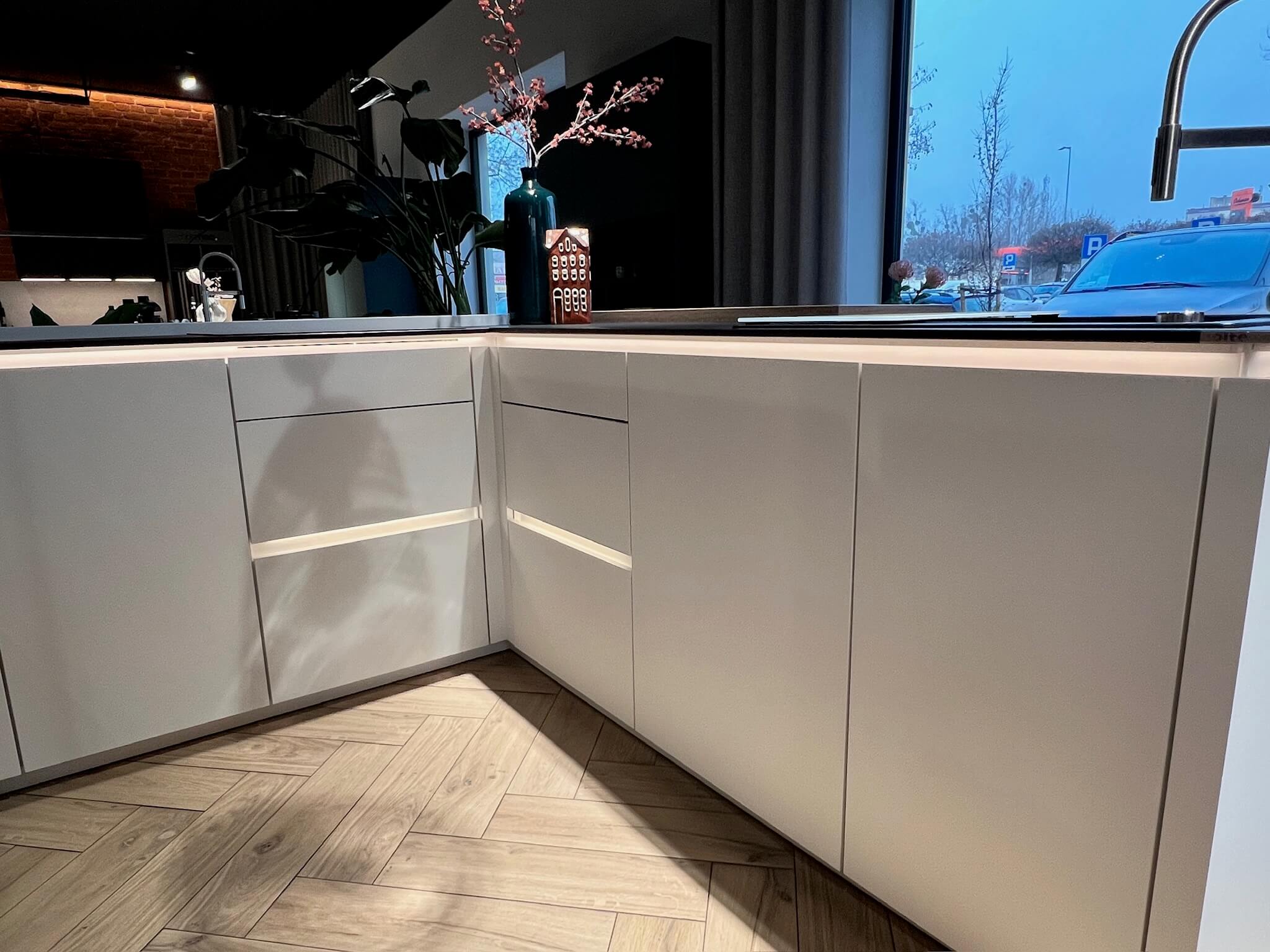 Cena dotyczy mebli z blatami oraz wyposażenia szuflad i oświetlenia, bez AGD. Idealna okazja, żeby wprowadzić do domu kuchnię premium Nolte w cenie ekspozycji.